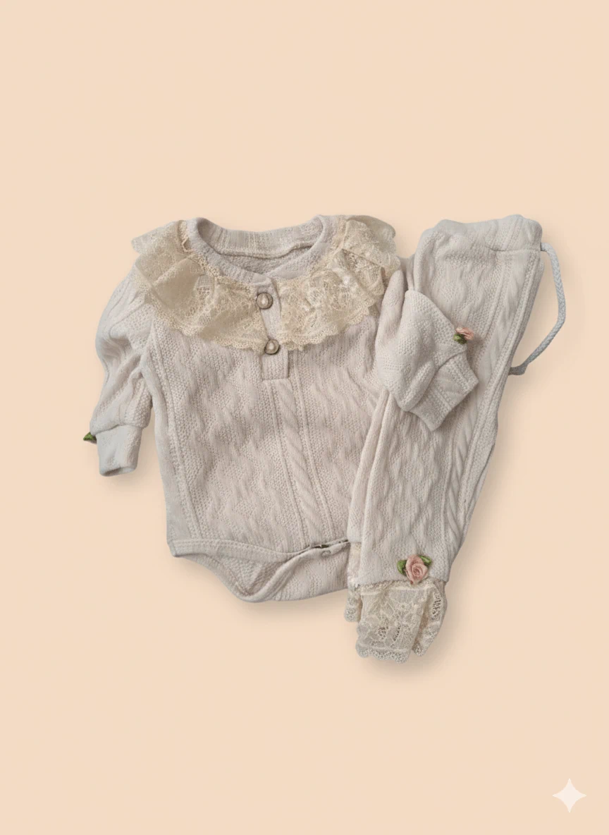 חליפת בגד גוף  ומכנס 2 חלקים מעוטר בתחרות